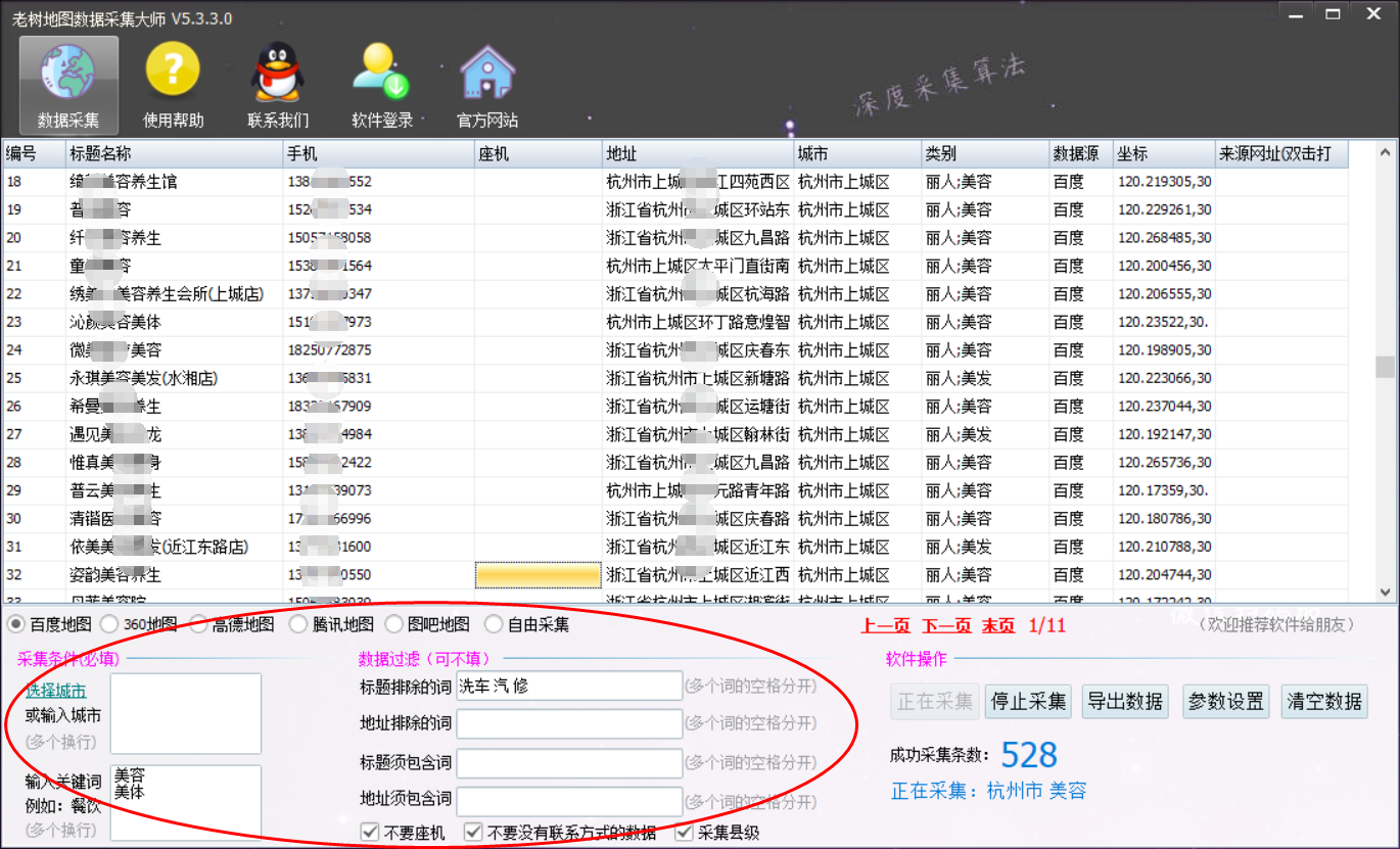 软件一键采集,地图包含百度地图、360地图、高德地图、腾讯地图、图吧地图。软件自动去重,导出到表格。