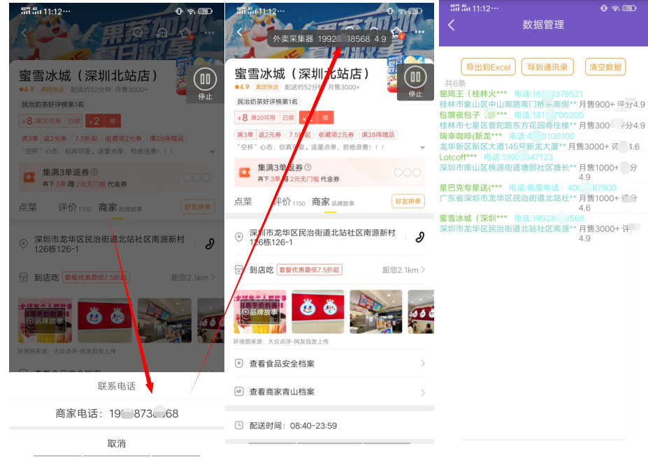 可以采集到商家名称、联系电话、地址、评分、月销量等数据。支持一键导出数据到Excel文件,一键导入数据到手机通讯录。