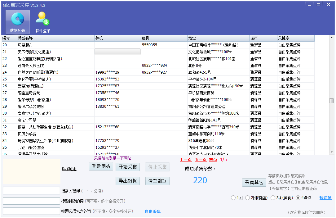 美团商家数据采集,可以采集到商家的标题名称,地址,联系方式,城市等数据,一键导出多种数据格式。