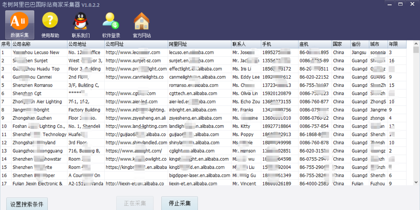 贸易商家电话数据采集软件,是基于alibaba.com的数据采集。模拟手工采集阿里巴巴国际站商家的数据采集软件,可以采集指定城市,指定关键词的商家信息,包括名称、地址、电话号码、网址等。